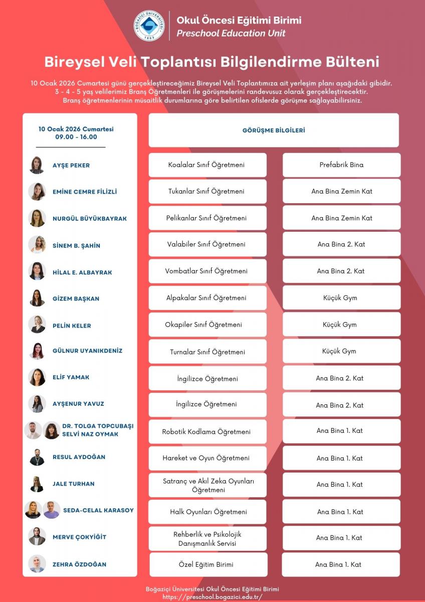 Çocuklarımızın 2025 - 2026 eğitim-öğretim yılı birinci dönem gelişim süreçlerinin paylaşılacağı “Bireysel Veli Toplantıları” 10 Ocak 2026 Cumartesi günü yapılacaktır. Arka sayfada randevu saatiniz belirtilmiştir. Randevu saatinde değişiklik talep eden velilerimiz sınıf öğretmenleri ile iletişime geçmelidir. Randevu sisteminde aksaklığa sebep olmamak adına görüşme saatinize zamanında gelme konusunda gereken hassasiyeti göstermenizi rica ederiz.