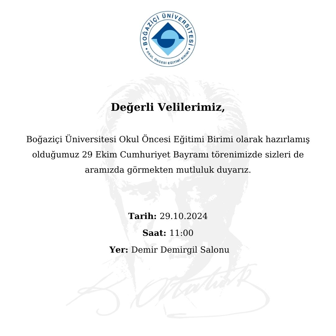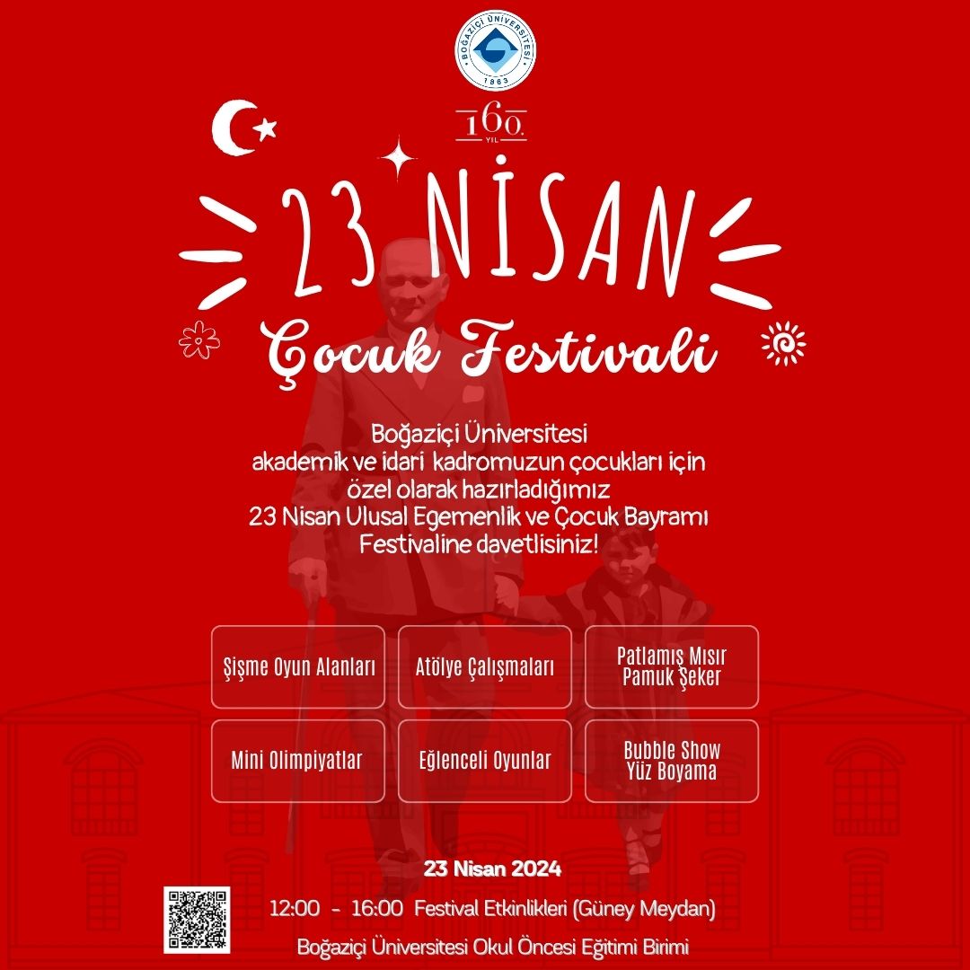 Boğaziçi Üniversitesi Okul Öncesi Eğitimi Birimi olarak, akademik ve idari kadromuzun çocukları için özel olarak hazırladığımız 23 Nisan Ulusal Egemenlik ve Çocuk Bayramı Festivaline davetlisiniz! Bu anlamlı günde, milli birlik beraberliğimizi pekiştirmemize ve çocuklarımızın coşkusuna ortak olan ailelerimize teşekkür ederiz.
