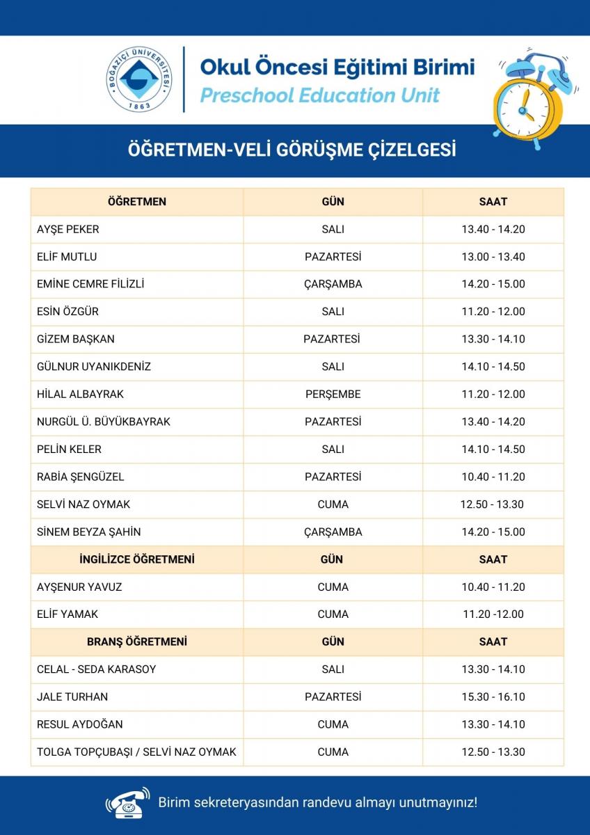 Çocuklarımızın 2025 - 2026 eğitim-öğretim yılı birinci dönem gelişim süreçlerinin paylaşılacağı “Bireysel Veli Toplantıları” 10 Ocak 2026 Cumartesi günü yapılacaktır. Arka sayfada randevu saatiniz belirtilmiştir. Randevu saatinde değişiklik talep eden velilerimiz sınıf öğretmenleri ile iletişime geçmelidir. Randevu sisteminde aksaklığa sebep olmamak adına görüşme saatinize zamanında gelme konusunda gereken hassasiyeti göstermenizi rica ederiz.