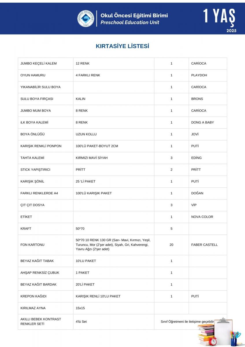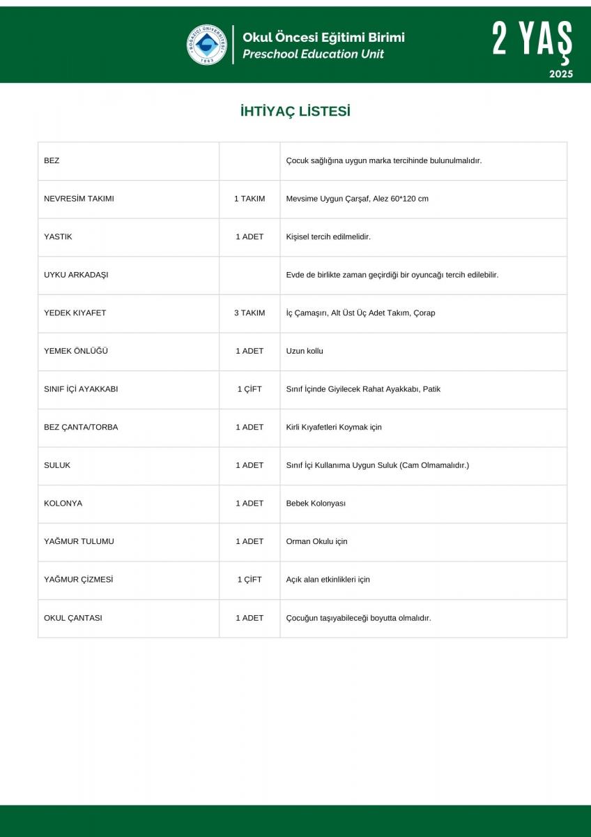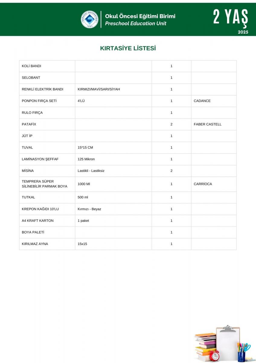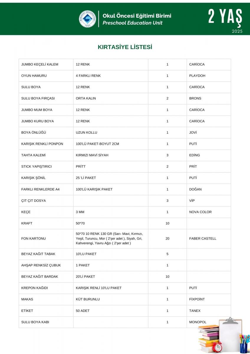 2 Yaş İhtiyaç - Kırtasiye Listesi Hk.