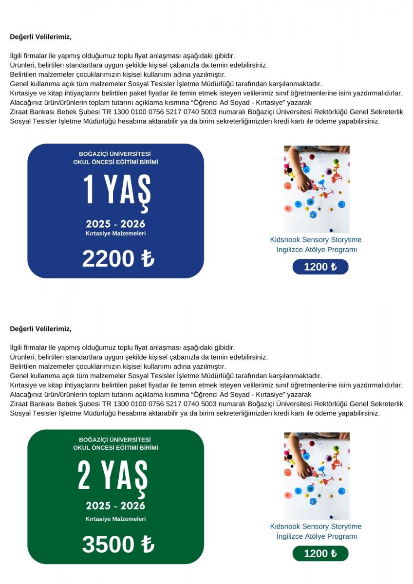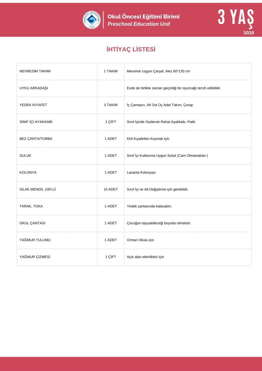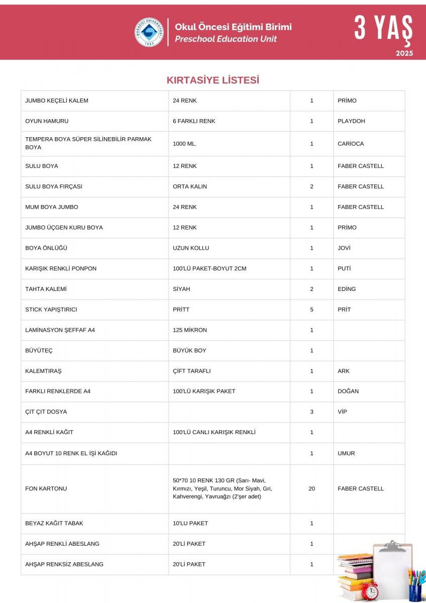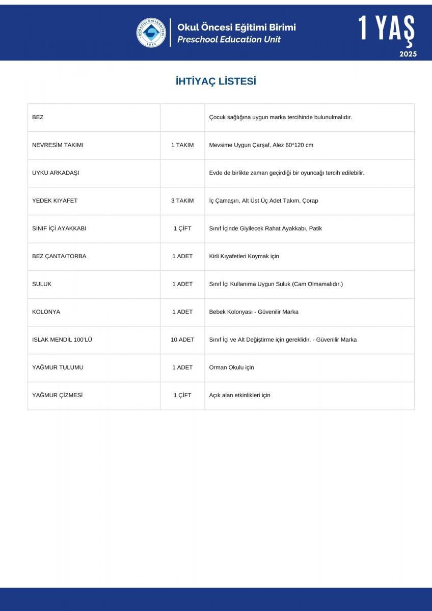 2 Yaş İhtiyaç - Kırtasiye Listesi Hk.