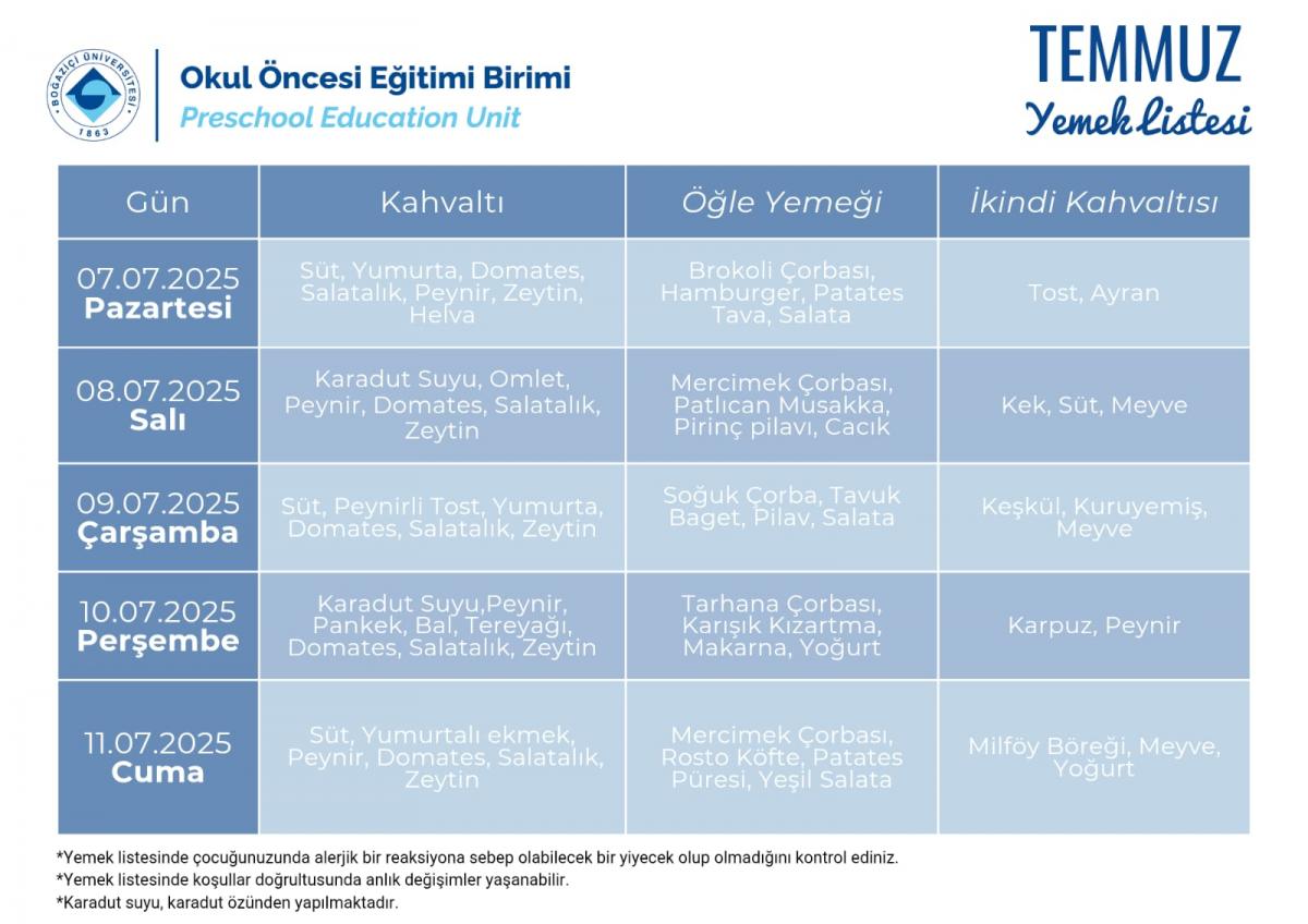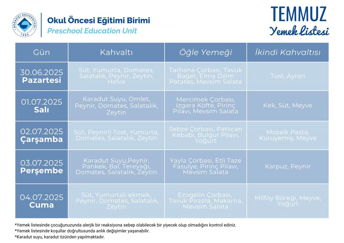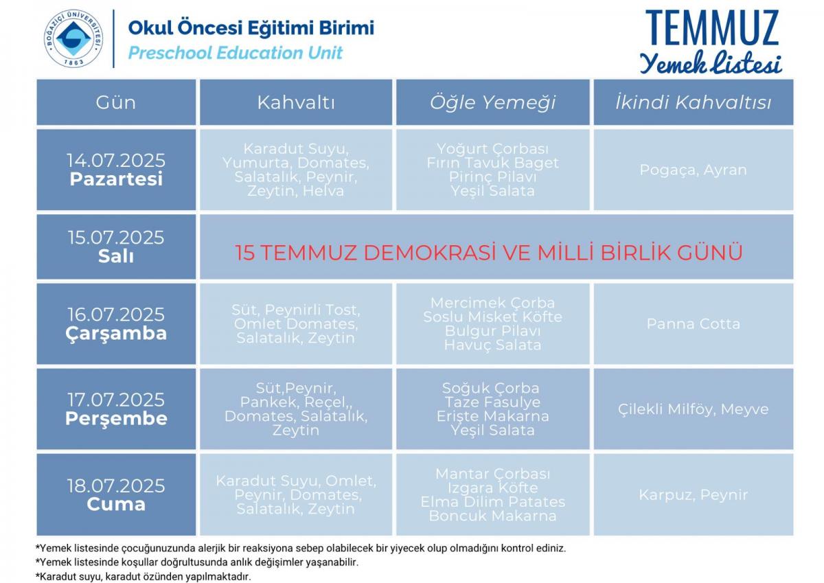 Temmuz Ayı Yemek Listesi